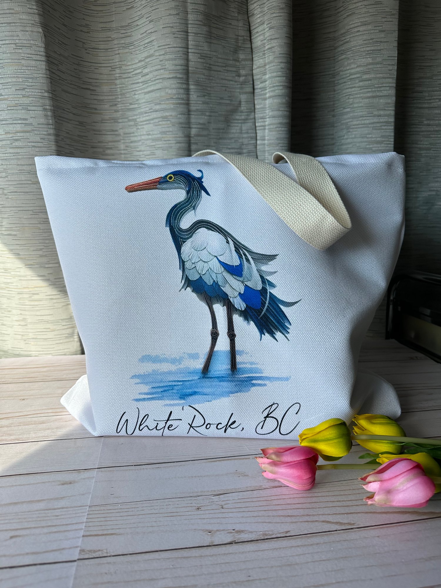 This listing has 2 different tote bags each one has a different blue heron design, please go through all the photos to see all of them and choose your favourite.